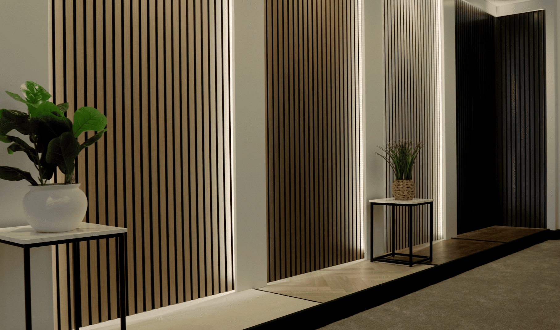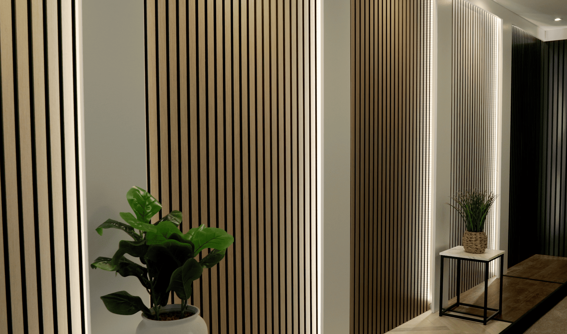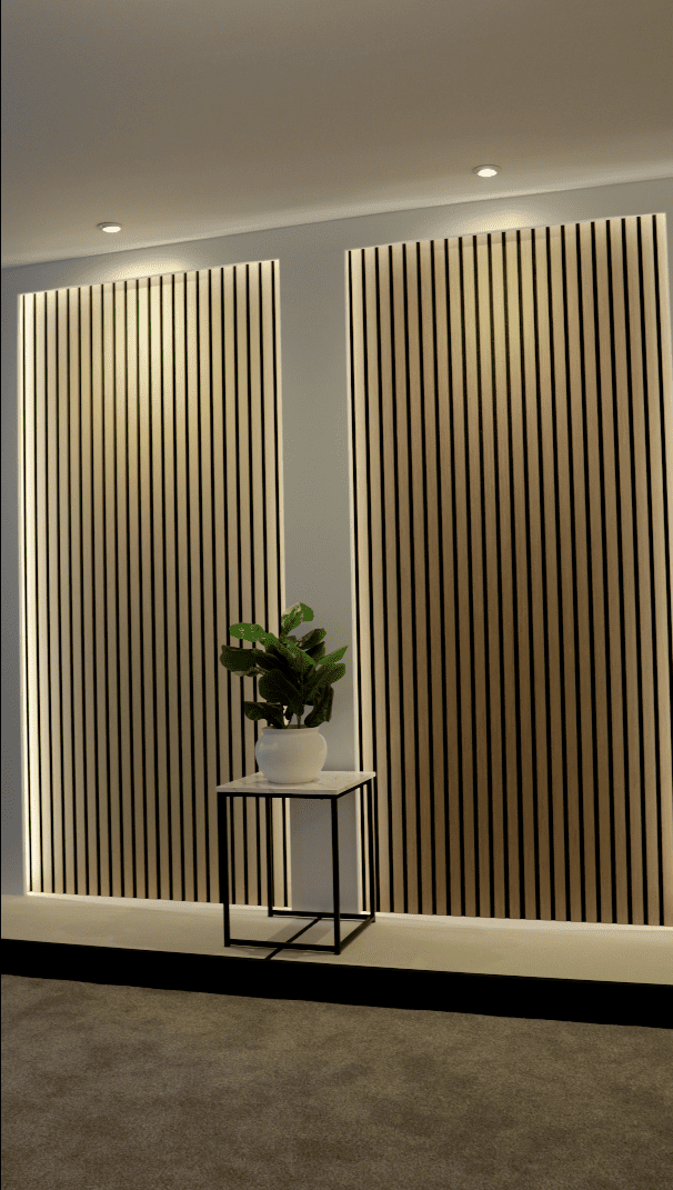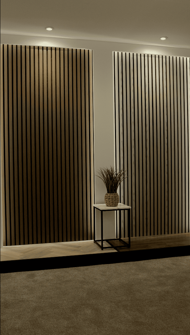 See how our decorative wood panels transform interiors with natural texture, rich finishes, and acoustic comfort — from cosy living rooms to modern offices.